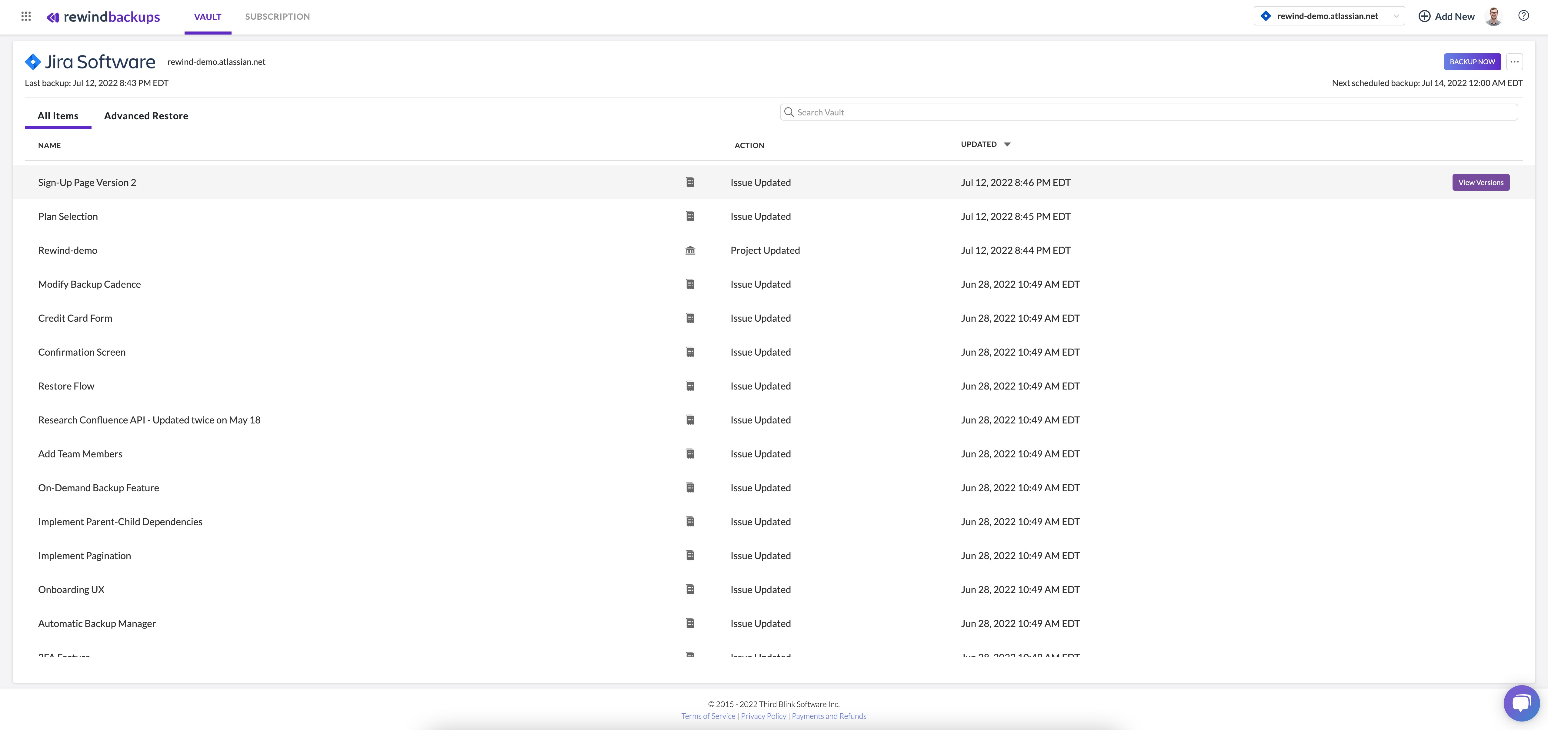 Note: Rewind for Jira Cloud provides a daily automated backup (ie. 'snapshot'). Before triggering an Item-Level Restore, it is recommended to use the Backup Now feature so that the latest state of your Jira Cloud instance is backed up. This will ensure that any changes since your last daily backup are saved.