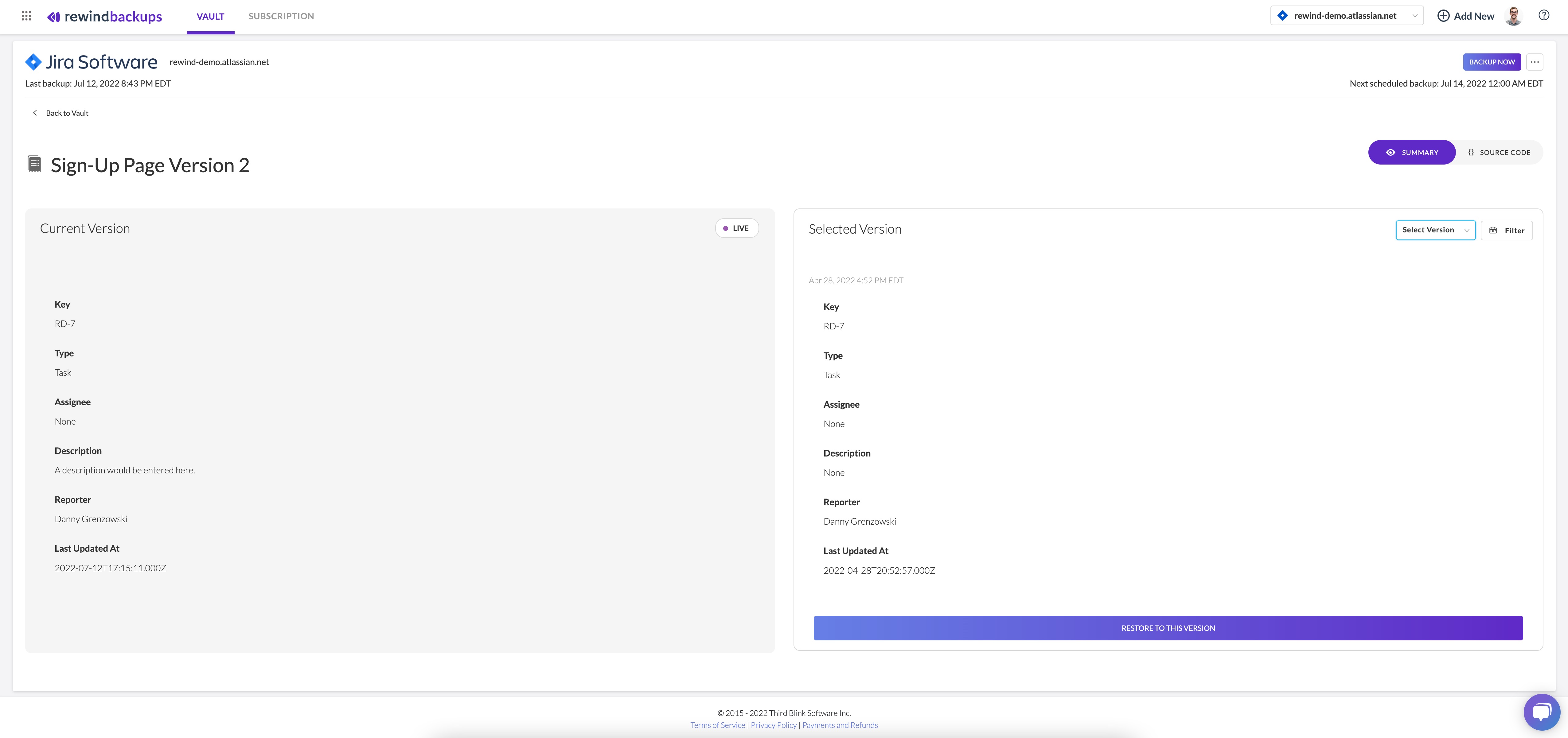 One of the ways that Rewind for Jira cloud can restore data is through an Item-Level Restore. An Item-Level Restore allows you to revert a specific item (ie. Issue) to one of its previous versions. This provides an 'undo button' for Jira Cloud, allowing you to recreate items that have been deleted, or simply revert unwanted changes.