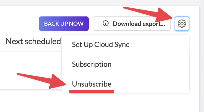 - Click on the gear button in the upper right corner, then "Unsubscribe" and then hit "Continue to uninstall” in the modal. Rest assured your historical backups will not be removed if you follow the next steps right away!