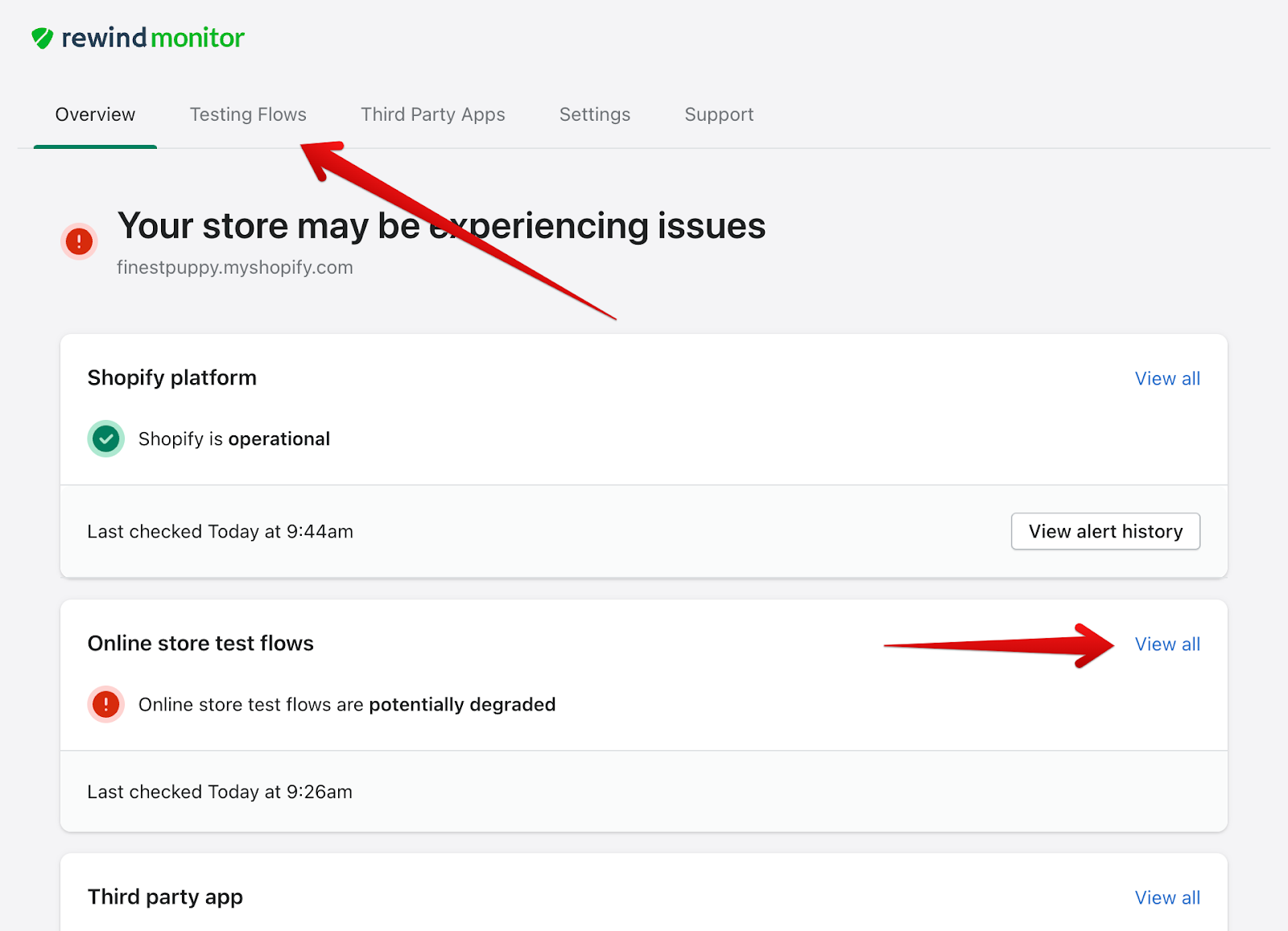 Rewind Monitor checks for impacts to your Shopify store and point-of-sale services so you can catch, communicate, and resolve potential issues before you:
